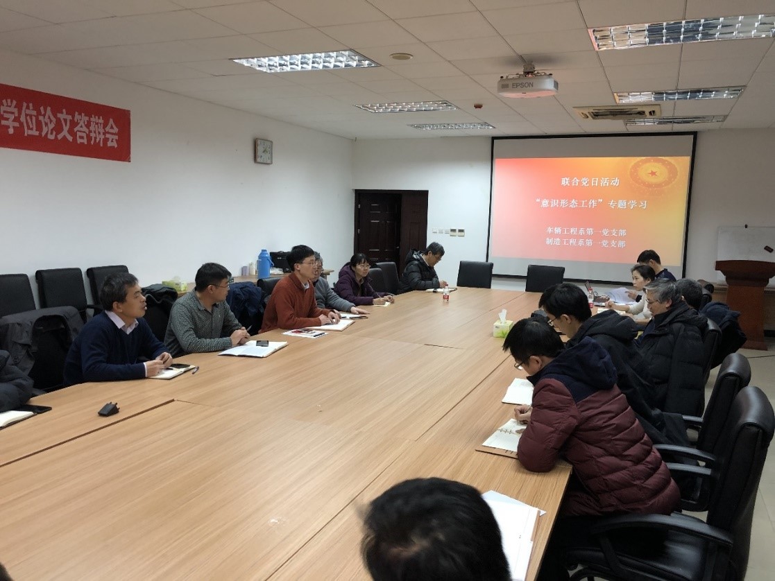 为深入贯彻落实习近平总书记重要指示精神,进一步加强和改进新时期高校意识形态工作在教师基层党支部扎根落实,2019年1月8日下午,Beat365官方网站车辆工程系第一党支部联合制造工程系第一党支部,在9号教学楼321会议室开展了“意识形态工作”专题学习联合党日活动。