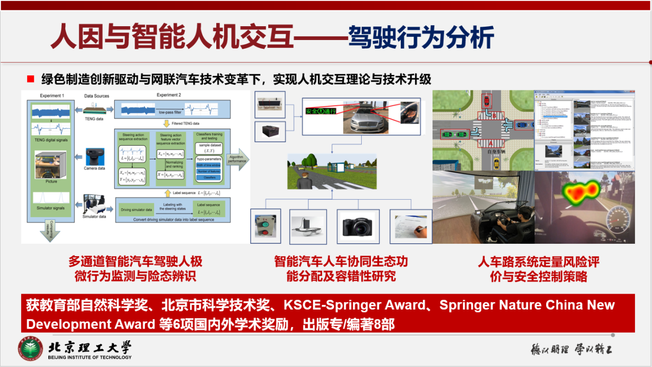 以智能制造/智能交通系统中的人机交互为核心,重点开展智能人机安全交互技术、认知行为形成机理与演变规律、驾驶行为建模分析与动态辨识方法等研究。对不同态势下人车系统微观行为的形成进行定量化模型描述,研究人车路系统各要素间交互作用的特性,重点揭示了人车单元纵横向微观运动规律,提出险态驾驶行为特征参数分析方法。依据环境对风险向量变化的扰动分析,提出面向技能基、规则基、知识基认知的人车实时交互方法,以视觉增强为本进行车辆行驶风险的智能交互支持与生态驾驶的作业优化布局,实现人车路危险因素的预警性控制。