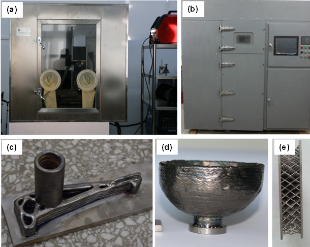 自主研发的电弧增材制造设备(图a)主要用于大型金属结构件制造,如某火炮零件(图c)和卫星贮箱样件(图d)等。激光选区熔化装备(图b)主要用于小型精密结构件制造,如点阵轻量化结构件(图e)。
