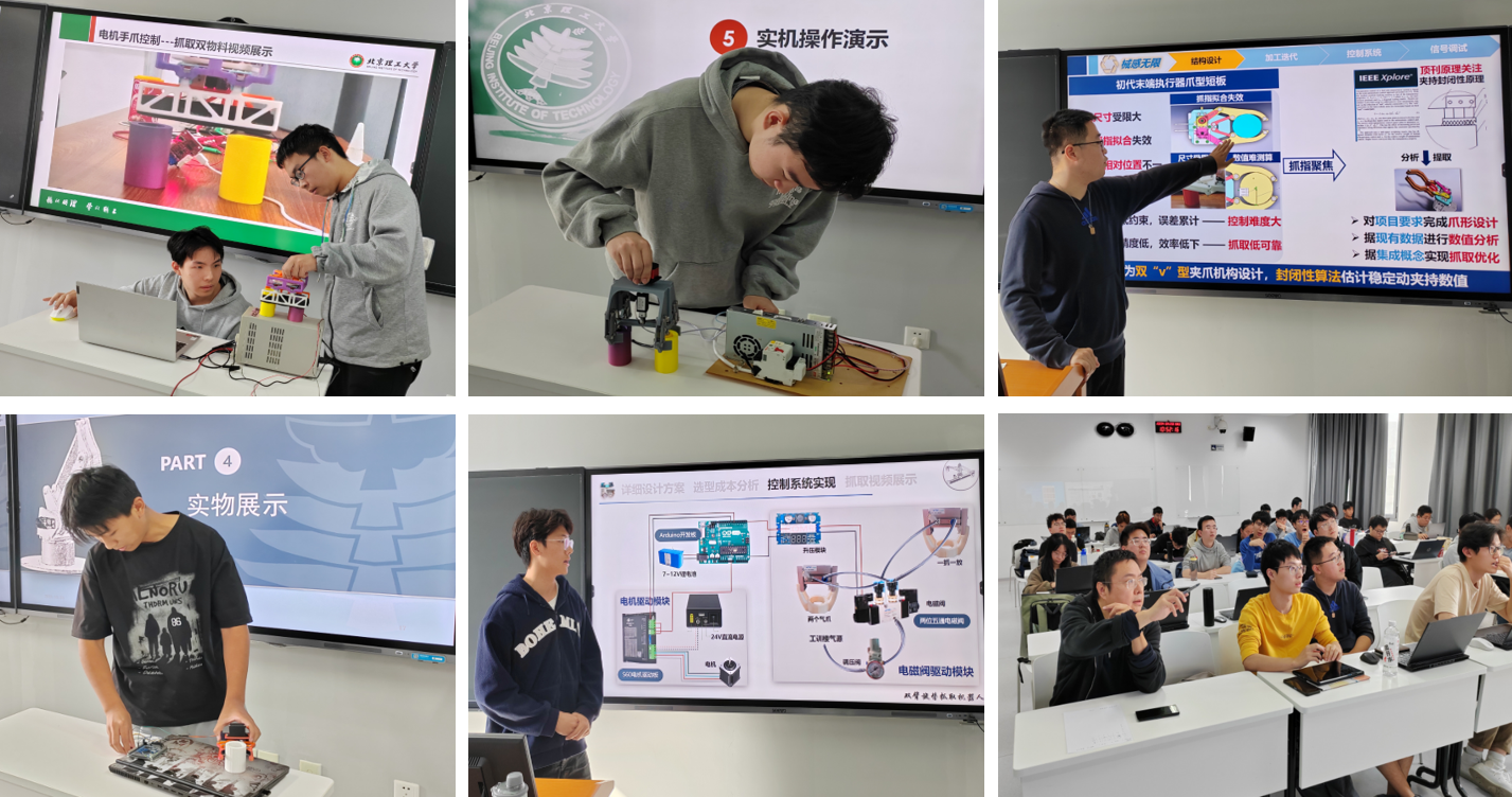 该课程的主要任务是开发一台用于物料搬运的机器人,中期检查是对机器人末端执行器(手爪)的研发过程与效果进行评价。通过陈述汇报、现场运行测试以及专家提问等环节,各组圆满完成了项目中期检查工作。师生积极开展交流讨论,现场气氛热烈。