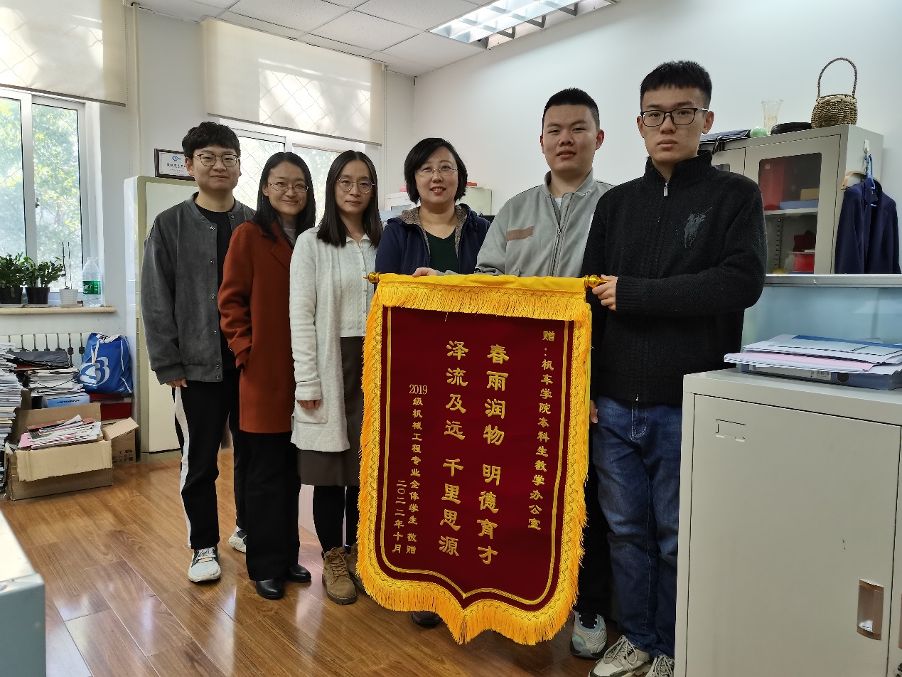 10月10日上午,2019级机械工程专业学生邓梁峰,罗奥成代表2019级机械工程专业全体学生,将印有“春⾬润物,明德育才,泽流及远,千⾥思源”的锦旗送到了机车学院本科生教学办公室,藉由近期推免工作圆满结束的契机,对办公室老师们在教学管理各方面,对同学们的辛勤付出和耐心帮助表示诚挚的谢意。