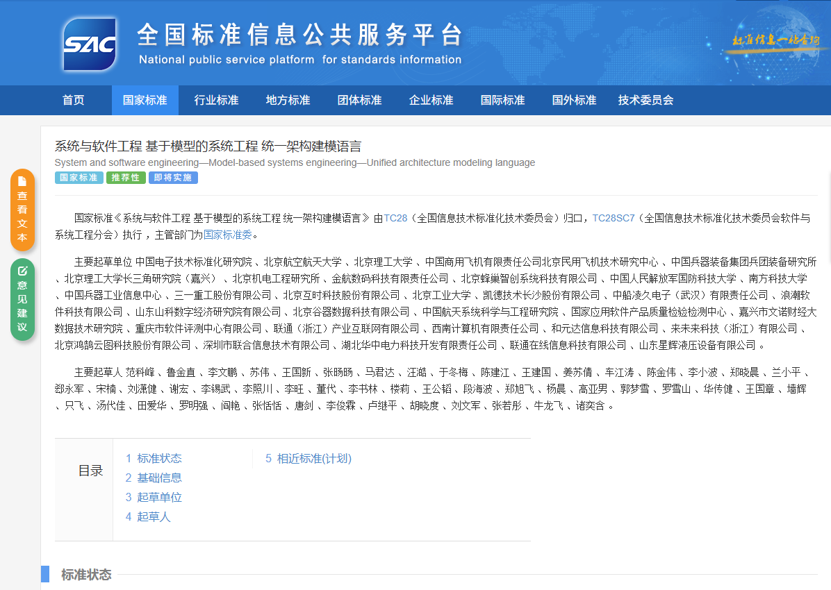 2025年5月30日,Beat365官方网站联合行业科研单位共同研发的《系统与软件工程 基于模型的系统工程 统一架构建模语言》国家标准(GB/T 45803-2025)正式发布。工业与智能系统工程研究所王国新教授、阎艳教授及团队作为主要起草人和技术贡献人,联合北京航空航天大学、中国电子技术标准化研究院,携手中国商用飞机有限责任公司北京民用飞机技术研究中心、中国兵器装备集团兵团装备研究所、中国兵器工业信息中心等多家单位,共同研发了我国系统工程领域首个自主原创的统一架构建模语言规范国家标准。