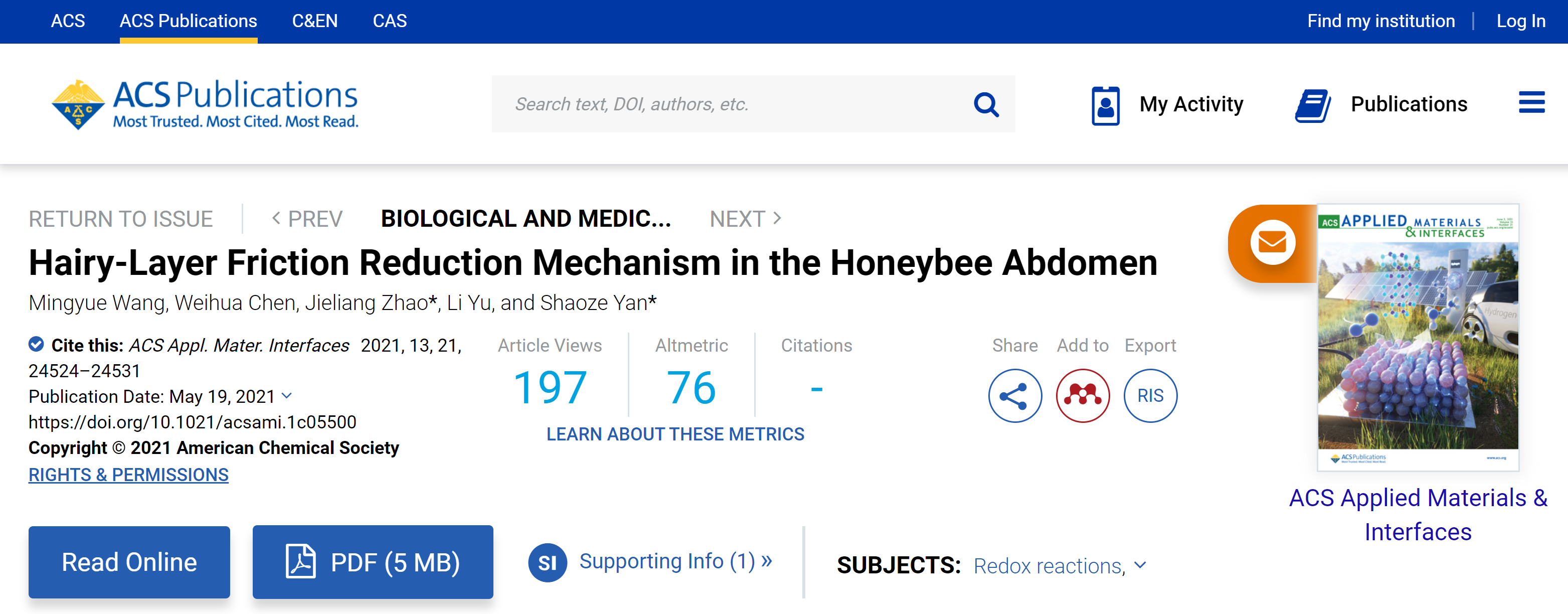 Mingyue Wang, Weihua Chen, Jieliang Zhao*, Li Yu, Shaoze Yan*. Hairy-Layer Friction Reduction Mechanism in the Honeybee Abdomen. ACS Appl. Mater. Interfaces 2021, 13, 21, 24524–24531