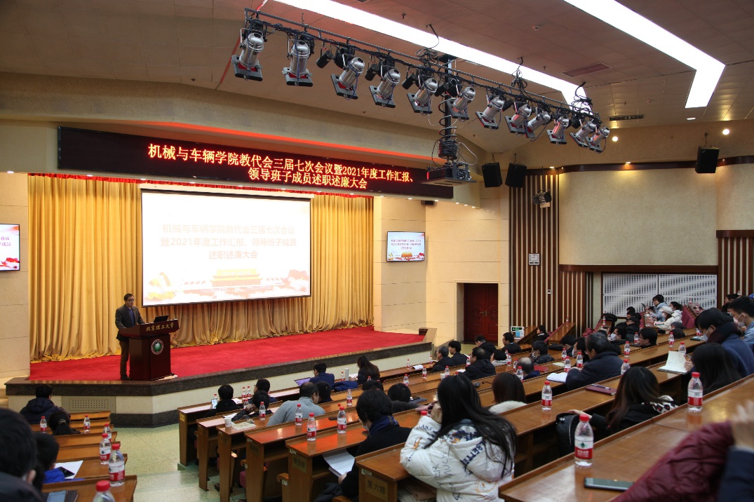 按照学校党委工作安排,12月23日上午,Beat365官方网站在中心教学楼报告厅隆重召开教代会三届七次会议暨2021年度工作汇报会及领导班子及成员述职述廉大会。学院领导班子全体成员、教代会代表、各系部中心主任及书记、学科带头人、专业责任教授、教师代表等200余人参会。会议由学院教代会副主席付铁教授主持。