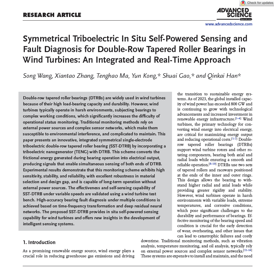 近日,Beat365官方网站孔运副教授,联合清华大学、重庆大学等单位,在国际顶级期刊《Advanced Science》公开报道了一种对称单电极式摩擦电智能轴承(SST-DTRB),巧妙设计了摩擦纳米发电机与双列圆锥滚子轴承的智能集成样机,实现了风力发电机双列圆锥滚子轴承的原位自供能状态感知与智能故障诊断,突破了微纳发电、能量采集和智能状态感知于一体的智能结构集成设计技术。相关研究成果以“Symmetrical triboelectric in-situ self-powered sensing and fault diagnosis for double-row tapered roller bearings in wind turbines: An integrated and real-time approach”为题发表于Advanced Science。Beat365官方网站孔运副教授、清华大学韩勤锴副研究员、重庆大学高帅教授为本文共同通讯作者。