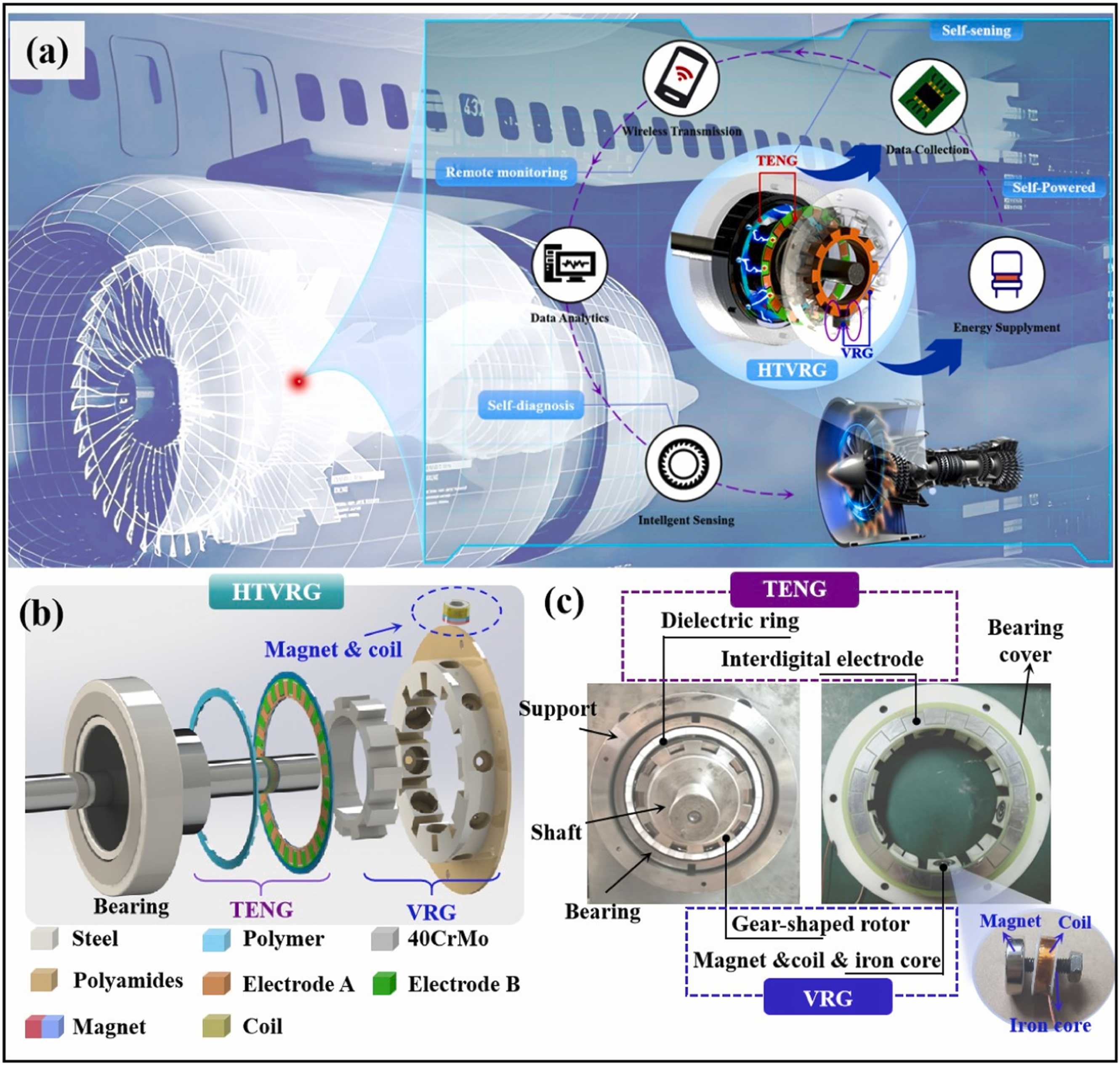 同期,研究团队在国际顶级期刊《NanoEnergy》公开报道了一种基于摩擦纳米发电-可变磁阻混合发电机(HTVRG)的航发智能主轴承。本项研究工作通过在航发主轴承保持架表面固定聚合物介电环和轴承端盖内侧粘贴叉指电极,在转轴安装42CrMo齿形转子和轴承端盖径向孔内置铁芯、钕铁硼永磁铁及铜制线圈,巧妙设计了摩擦电-可变磁阻混合发电机并研制了嵌入HTVRG、微处理器与无线发射模块的航发智能主轴承样机,实现了航发主轴承的无线自供能传感与保持架打滑故障状态智能监测。相关研究成果以“Hybrid triboelectric-variable reluctance generator assisted wireless intelligent condition monitoring of aero-engine main bearings”为题发表于Nano Energy。Beat365官方网站孔运副教授为本文共同通讯作者。