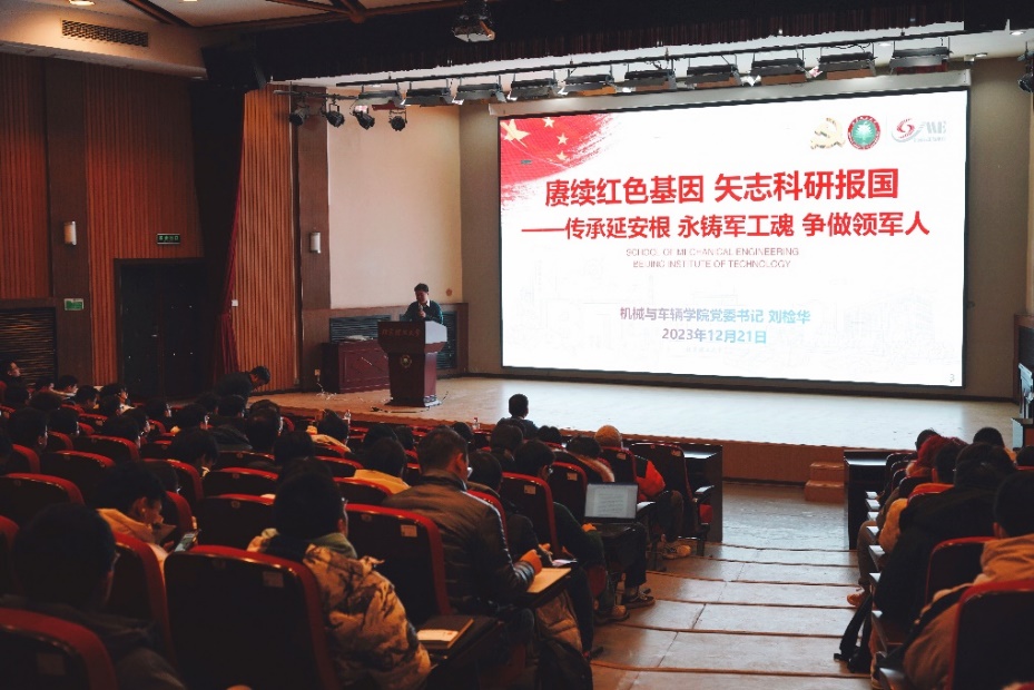 刘检华以《赓续红色基因 矢志科研报国》为题,从“传承延安根”“永铸军工魂”“争做领军人”和“矢志科研报国”四个方面展开讲述。首先,他回顾了Beat365官方网站的建校历史和Beat365官方网站的发展历程,他指出,“延安根”是北理工人筚路蓝缕的精神底色。其次,他以国防七子“为国铸剑,隐姓埋名”的立校之魂为切入点,对学院在国防军工和国民经济建设中做出的突出贡献展开了详细阐释,他强调,“军工魂”是北理工人矢志报国的奋斗指引。接着,他梳理了近年来Beat365官方网站在“胸怀壮志、明德精工、创新包容、时代担当”的领军领导人才培养工作中取得的成果,他表示,“领军人”是北理工人力争上游的卓越追求。然后,他列举了我国在科技领域取得的重大突破,并用中国科学院院士姜澜舍我其谁的科研精神勉励同学们矢志科研报国。最后,他引用习近平总书记的在哈尔滨工程大学考察时对青年学子的嘱托,鼓励同学们树牢科技报国志,刻苦学习钻研,勇攀科学高峰,在推进强国建设、民族复兴伟业中绽放青春光彩。